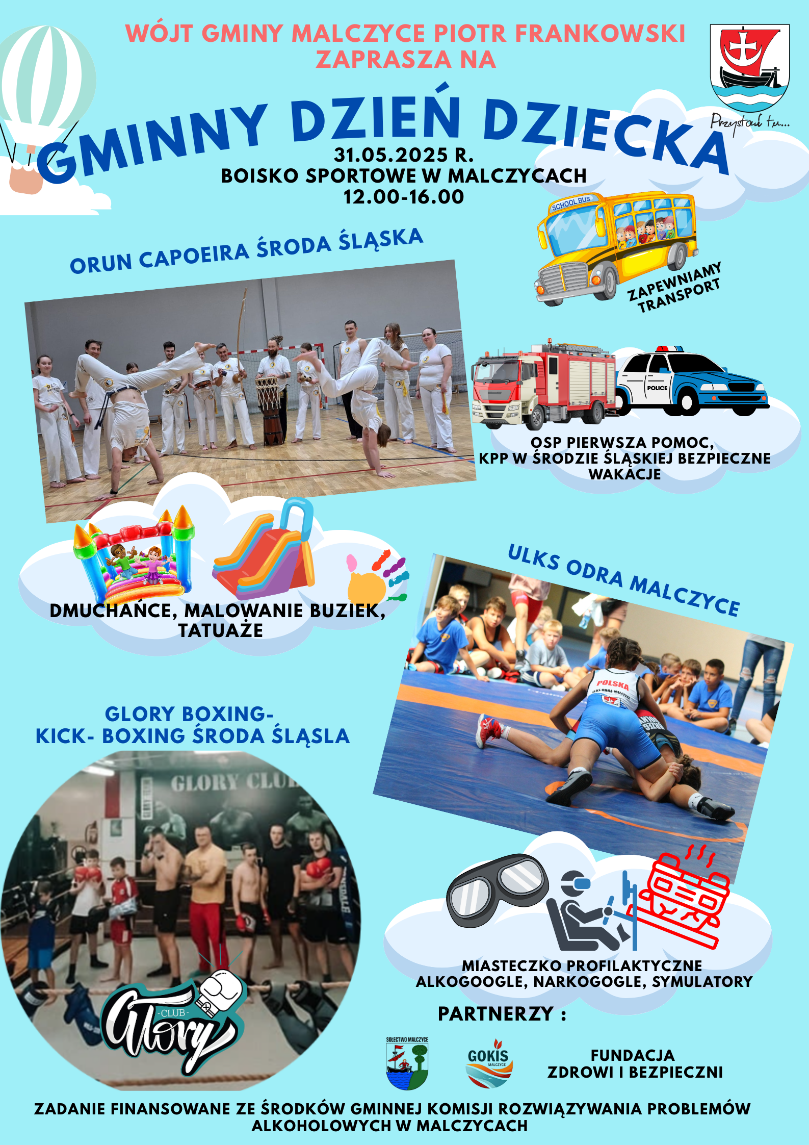 Zapraszamy 31 maja na Gminny Dzień Dziecka na boisko sportowe przy ul. Mickiewicza w Malczycach. Czeka na was moc atrakcji :