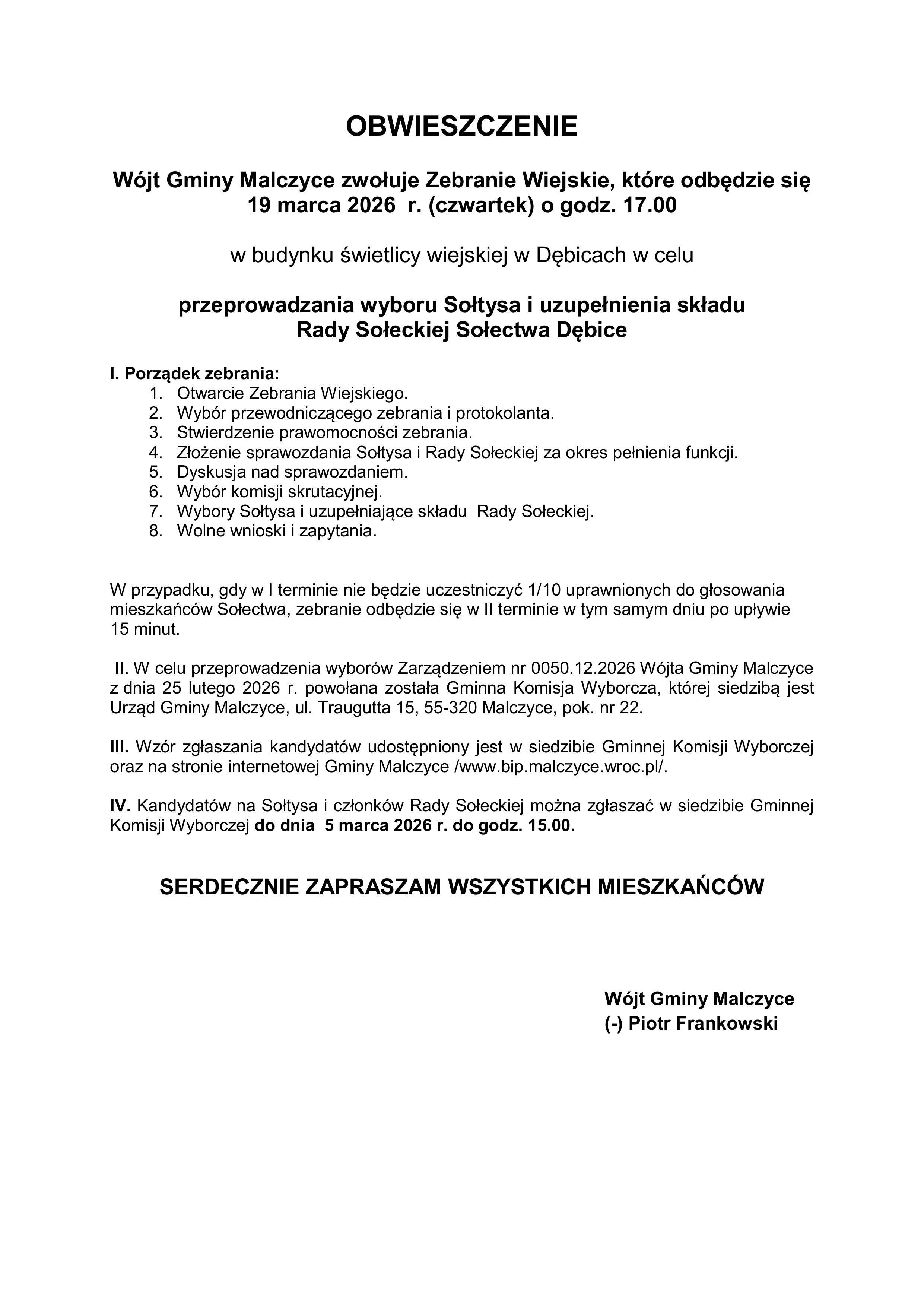 Wybory Sołtysa i uzupełnienie składu Rady Sołeckiej w Sołectwie Dębice